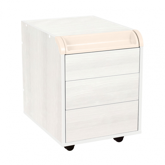 Тумба состоит из трех больших ящиков с технологией push-to-open (ящики открываются простым нажатием) для удобного хранения различных предметов, таких как учебники, тетради, канцелярские принадлежности и другие мелочи.